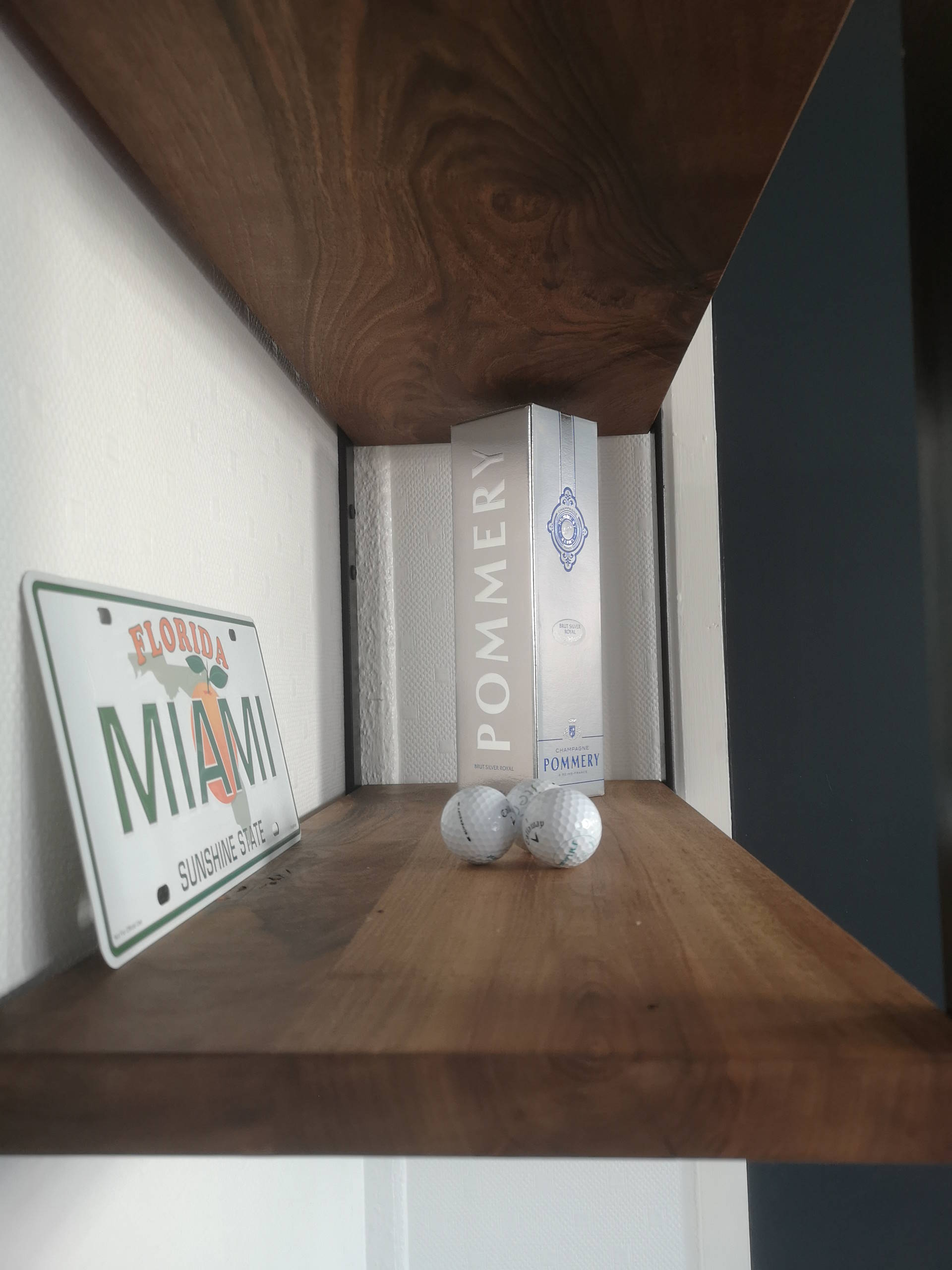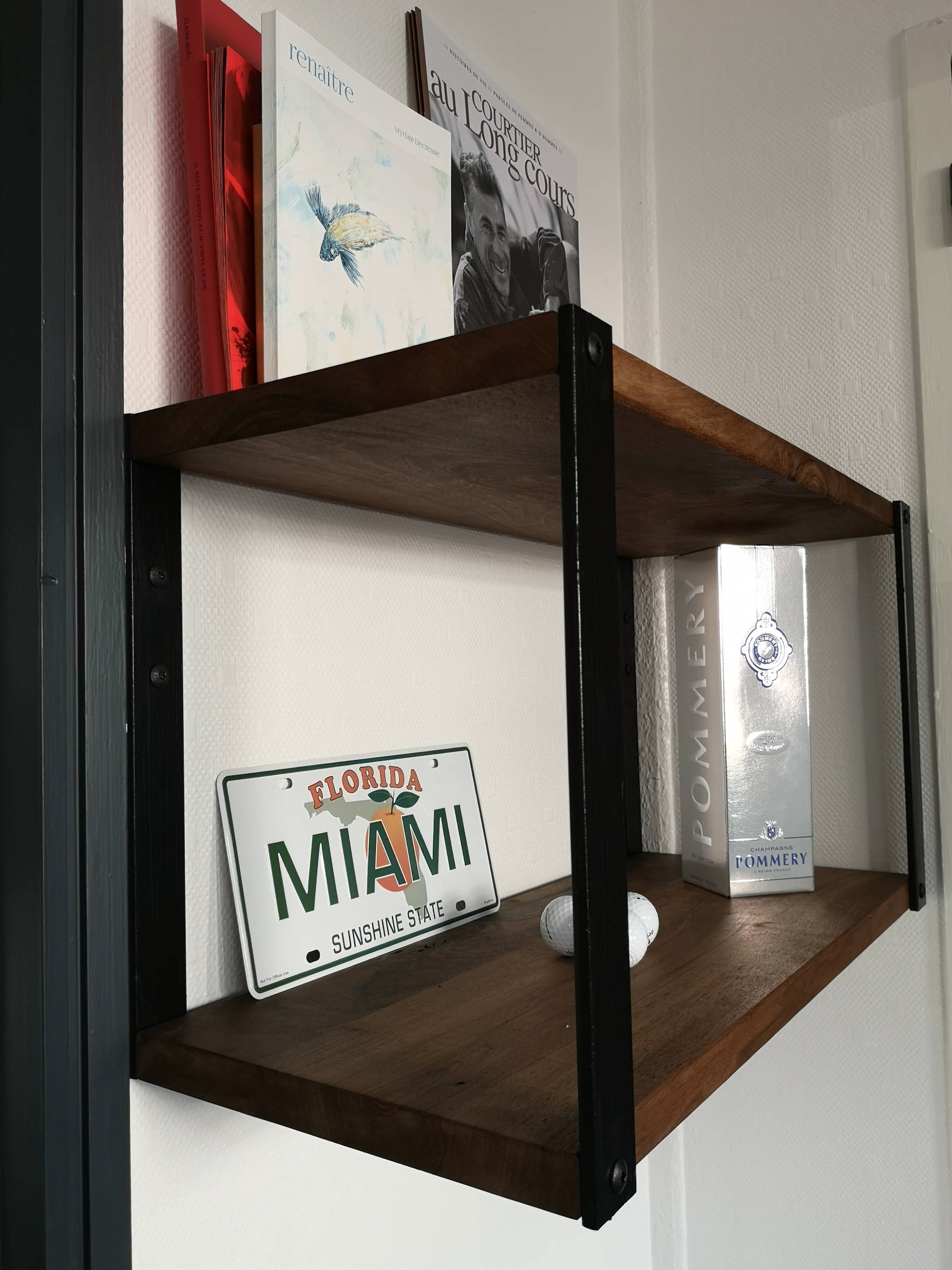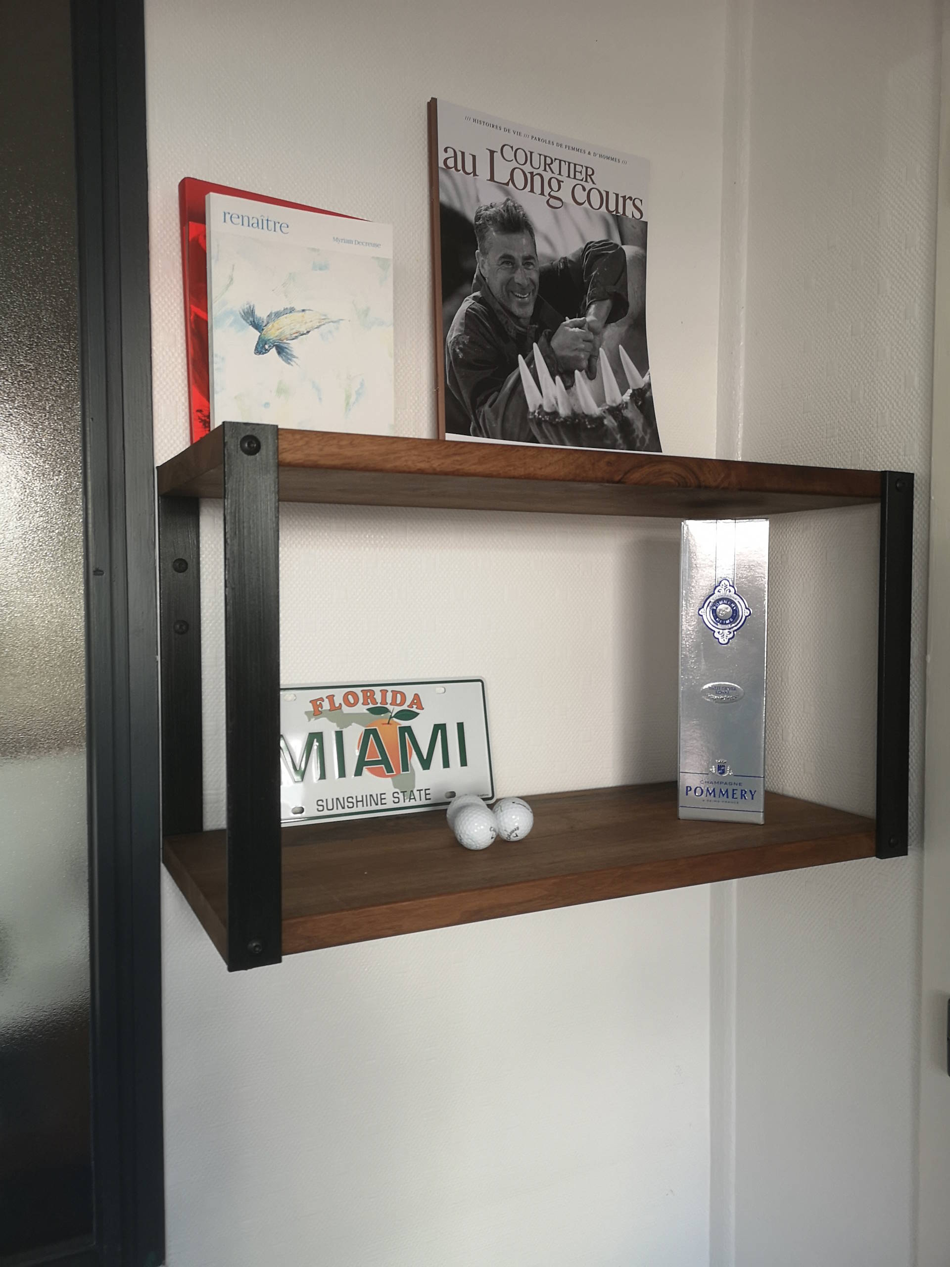 Idéale pour organiser un espace, exposer des objets décoratifs, présenter des livres, ou valoriser une bouteille de champagne, cette étagère murale apporte immédiatement du caractère à n’importe quel intérieur. Elle s’intègre aussi bien dans un salon cosy que dans un bureau professionnel, une chambre, une entrée ou un commerce. Le bois massif local offre une chaleur naturelle tandis que les montants en métal noir apportent une touche industrielle raffinée, inspirée de l’esthétique Bauhaus qui guide notre travail : sobriété et authenticité.