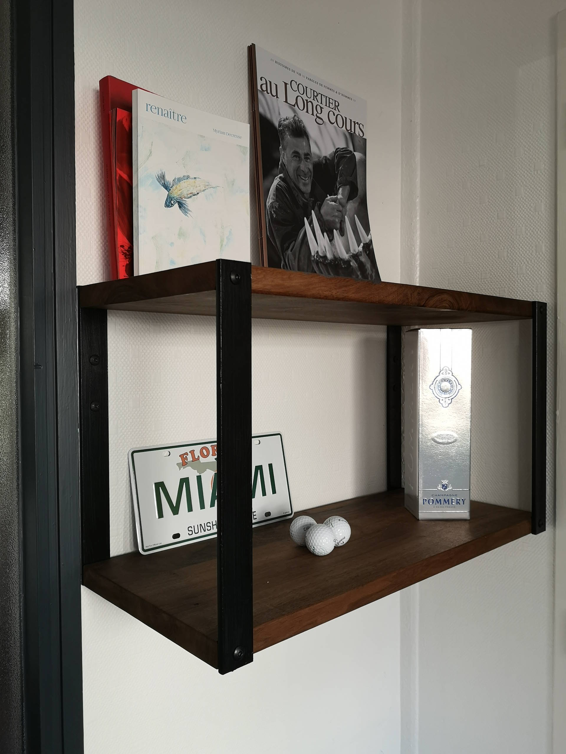 Étagère murale en bois massif et acier, fabriquée artisanalement en Bourgogne-Franche-Comté. Un design sobre, robuste et chaleureux, idéal pour sublimer vos murs avec une touche authentique et durable.