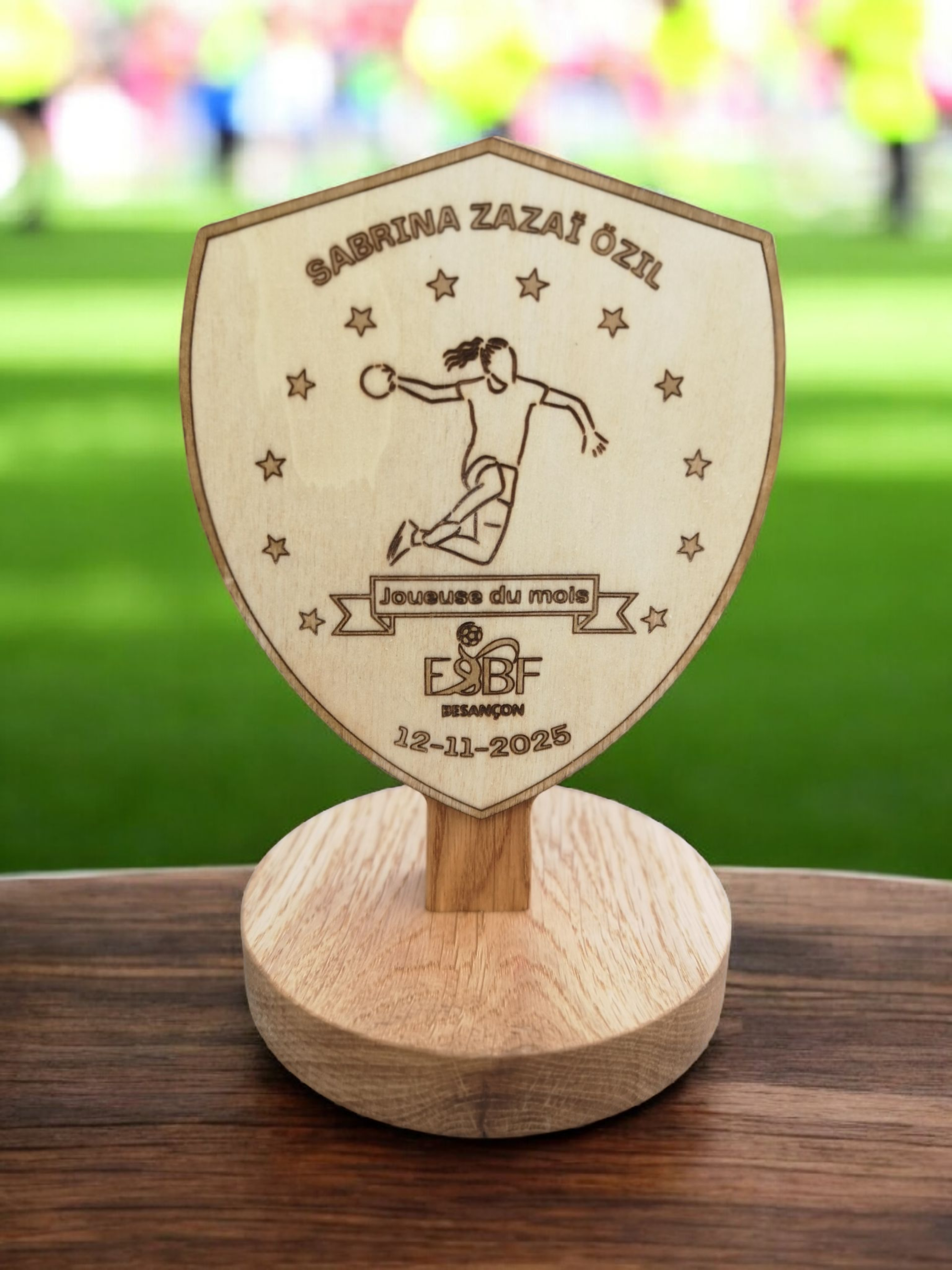Trophée joueuse du mois ESBF en bois massif, dans une version au design blason gravé, fabriqué artisanalement pour valoriser les performances sportives.