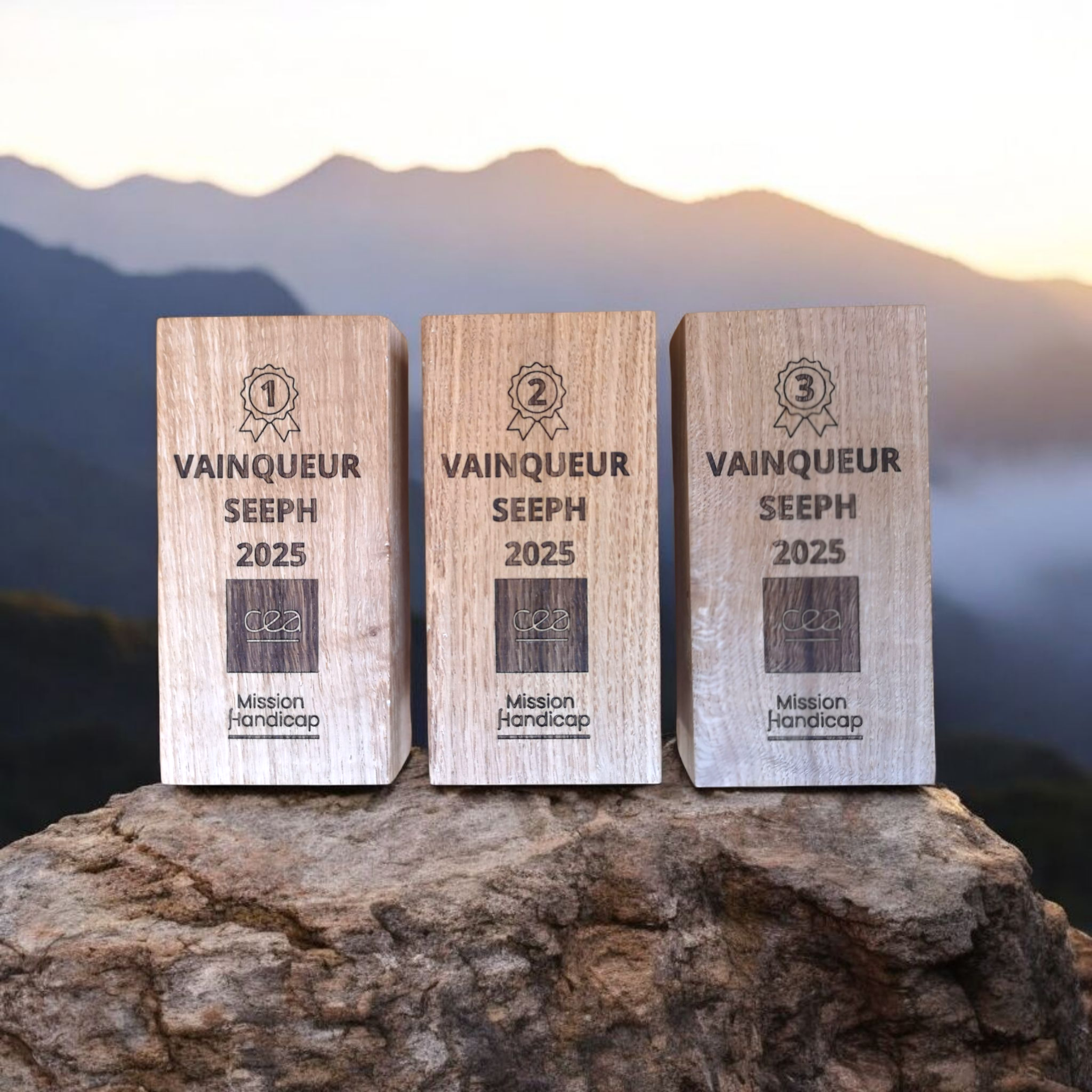 Trophée en bois massif conçu sur mesure pour le CEA Cadarache à l’occasion de la SEEPH 2025. Une création artisanale élégante, durable et personnalisable pour valoriser l’engagement et les réussites.